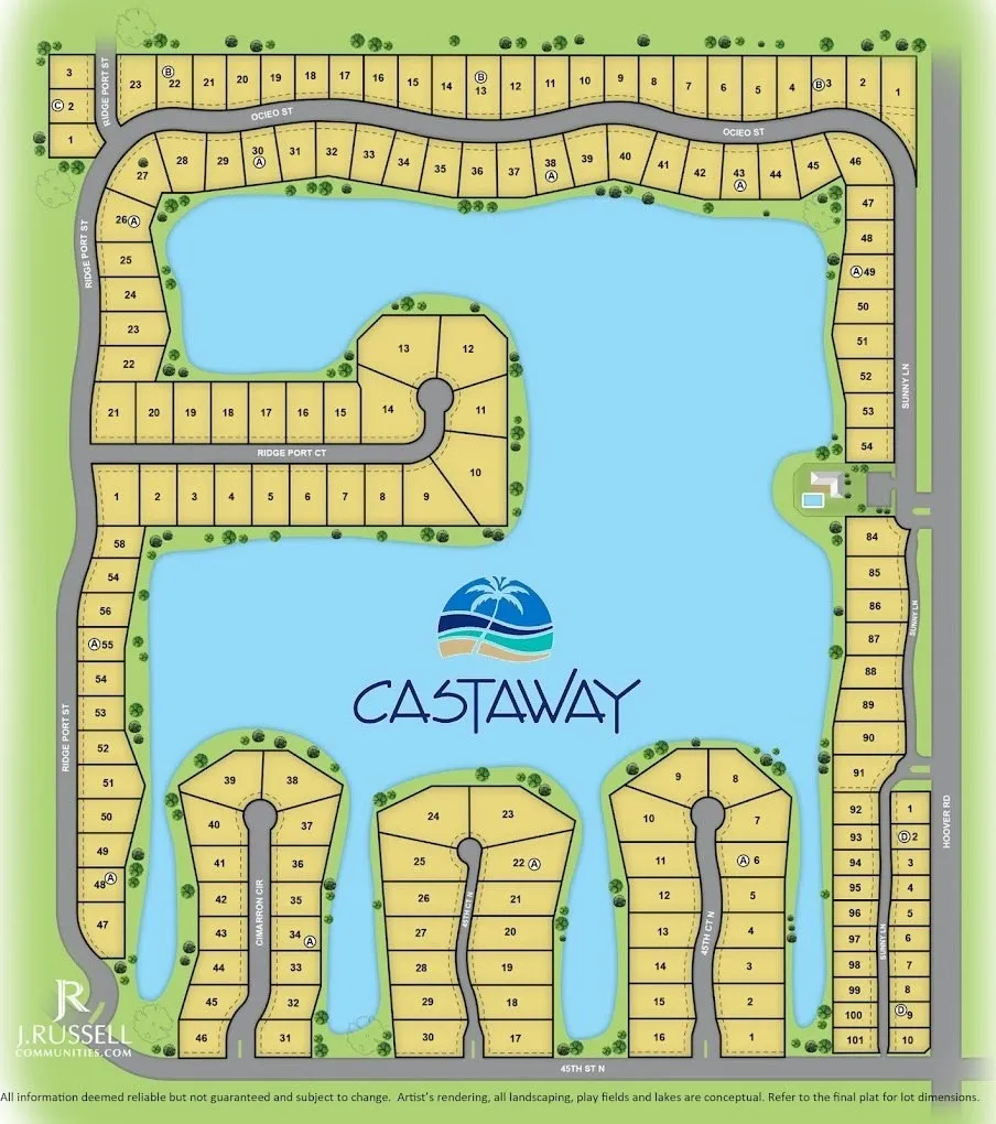 Residents of Castaway enjoy access to resort-style amenities including a private lake ideal for boating, paddleboarding, swimming, and lakeside relaxation, along with a clubhouse, pool, walking paths, and beach areas. The community is designed for both recreation and serenity, blending active living with peaceful surroundings.